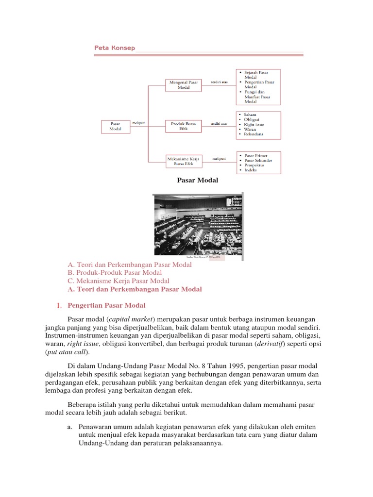 Kata investasi diidentikkan dengan penanaman modal dengan tujuan untuk memperoleh keuntungan di masa yang akan datang. Pasar modal mempertemukan pihak yang membutuhkan dana jangka panjang dengan pihak yang membutuhkan sarana investasi pada produk keuangan (saham. Capital market atau pasar modal, merupakan kegiatan yang berhubungan dengan penawaran umum dan perdagangan efek, perusahaan publik yang berkaitan dengan efek yang diterbitkannya, serta lembaga dan profesi yang berkaitan dengan efek.