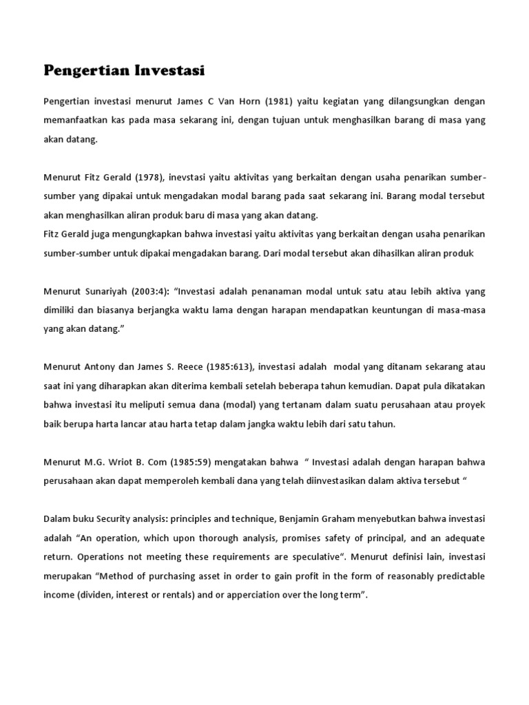 Investasi (investment) berperan seperti kendaraan yang membantu kita mempercepat kita mencapai tujuan keuangan. Menurut hartono (2000) terdapat dua tipe investasi yaitu : Pengertian modal) ke suatu perusahaan.