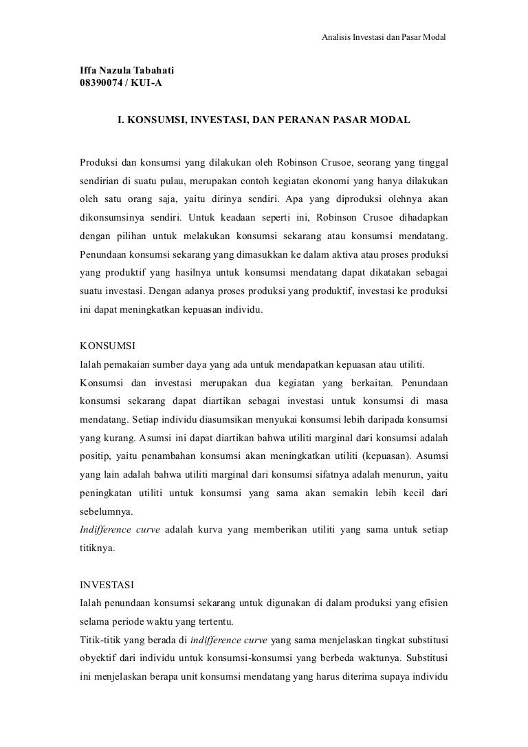 Individu melakukan melakukan konsumsi dengan memakai sumber daya yg ada untuk mendapatkan kepuasan atau utility. Didalam dunia modern saat ini, investasi banyak sekali dicari dan dijalankan untuk ladang bisnis nya. Konsumsi,investasi dan peranan pasar modal 1.2 konsumsi konsumsi dan investasi merupakan dua kegiatan yg berkaitan.
