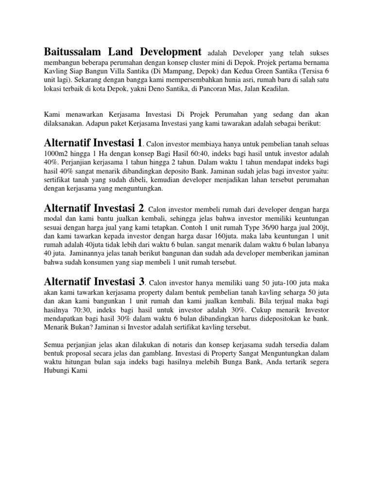Harga tanah tidak pernah turun. Investasi adalah upaya menciptakan penghasilan atau keuntungan di masa depan, lewat suatu kegiatan yang dilakukan pada saat ini. Banyak contoh proposal kerjasama bisnis di bidang properti yang dibuat sangat tebal, sehingga saat melihatnya saja sudah merasa pusing apalagi membacanya.