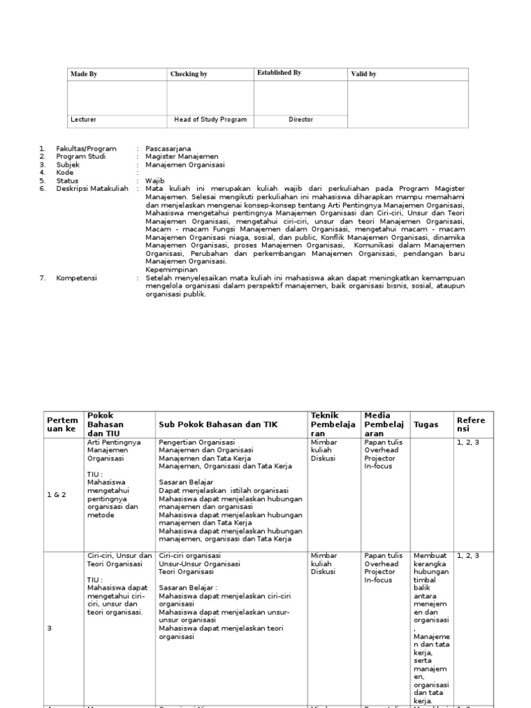 Silabus Dan SAP Matakuliah Manajemen Organisasi (MM UBD)